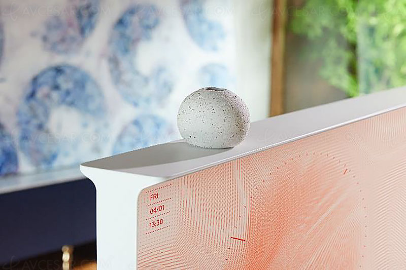 In terms of the particularities of Samsung The Serif TVs, in addition to their iconic design, we notice a flat location on the top of the TV that can serve as a shelf (see first photo above). Namely, it is equipped with an NFC chip (see second photo above), the latter allows the pairing in a few seconds of a smartphone to transform the television equipped with a 4.0 audio system, delivering a total power of 40 W, in Hi-Fi system, and to enjoy the music stored on the mobile terminal.