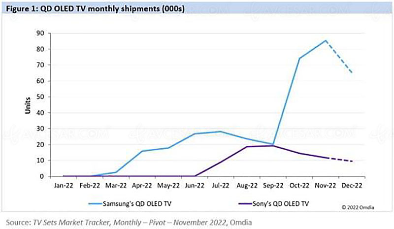 Last precision, Omdia forecasts QD Oled TV sales up 141% in 2023 compared to 2022. Similarly, the research firm announces that TCL, Philips and Sharp will join the camp of QD Oled technology supporters in 2023 (Editor's note: if TCL announced its intention to market a QD Oled TV at the end of 2023 at the start of CES 2023 at the beginning of last week, it finally reconsidered its words at the end of the show, see our CES 23 news > TV QD Oled TCL in 2023, full reverse: release cancelled!).