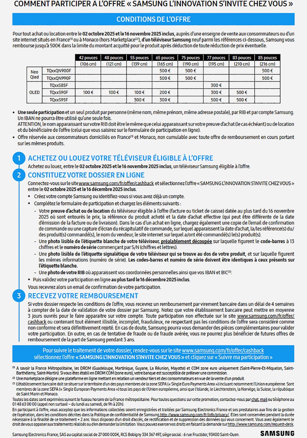 More details on the offer in participating stores or on the brand's website: www.samsung.com/fr/offer/cashback