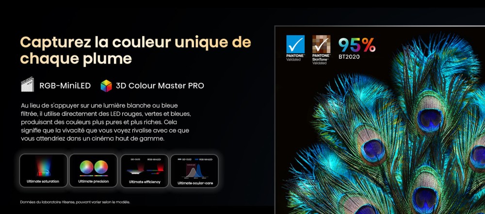 … for natural tones££££ As we have seen, RGB-MiniLED technology is based on a triplet of three LEDs, one red, one green and one blue. The quantum filter is therefore no longer necessary to reproduce these three basic colors. The natural radiation of the three LEDs makes it possible to directly reproduce a color image. The television's video processor can thus very effectively control the brightness and color generated by each diode in an RGB-MiniLED triplet, and with great finesse. The benefits that this technology brings in this area are immediately visible. And the measurements announced by Hisense are also excellent: 95% coverage of the BT.2020 color space, which guarantees that 72% of the spectrum visible to the human eye is reproduced, and 134.78% of DCI-P3. Exceptional results never before seen on a television.