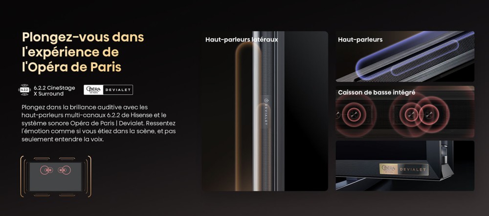 Hisense 116 UXQ, 6.2.2 audio system Opéra de Paris by Devialet££££ The Hisense 116UXQ TV is not content with a spectacular image. Its 6.2.2 sound system, composed of six speakers, two subwoofers and two vertical modules for Dolby Atmos effects, offers an audio spectacle worthy of a concert hall and more specifically the acoustics of the Opéra Garnier, as indicated by the Opéra de Paris by Devialet label. Its objective: to transform each viewing session into a sensory experience, where image and sound merge to create a unique cinematic atmosphere.