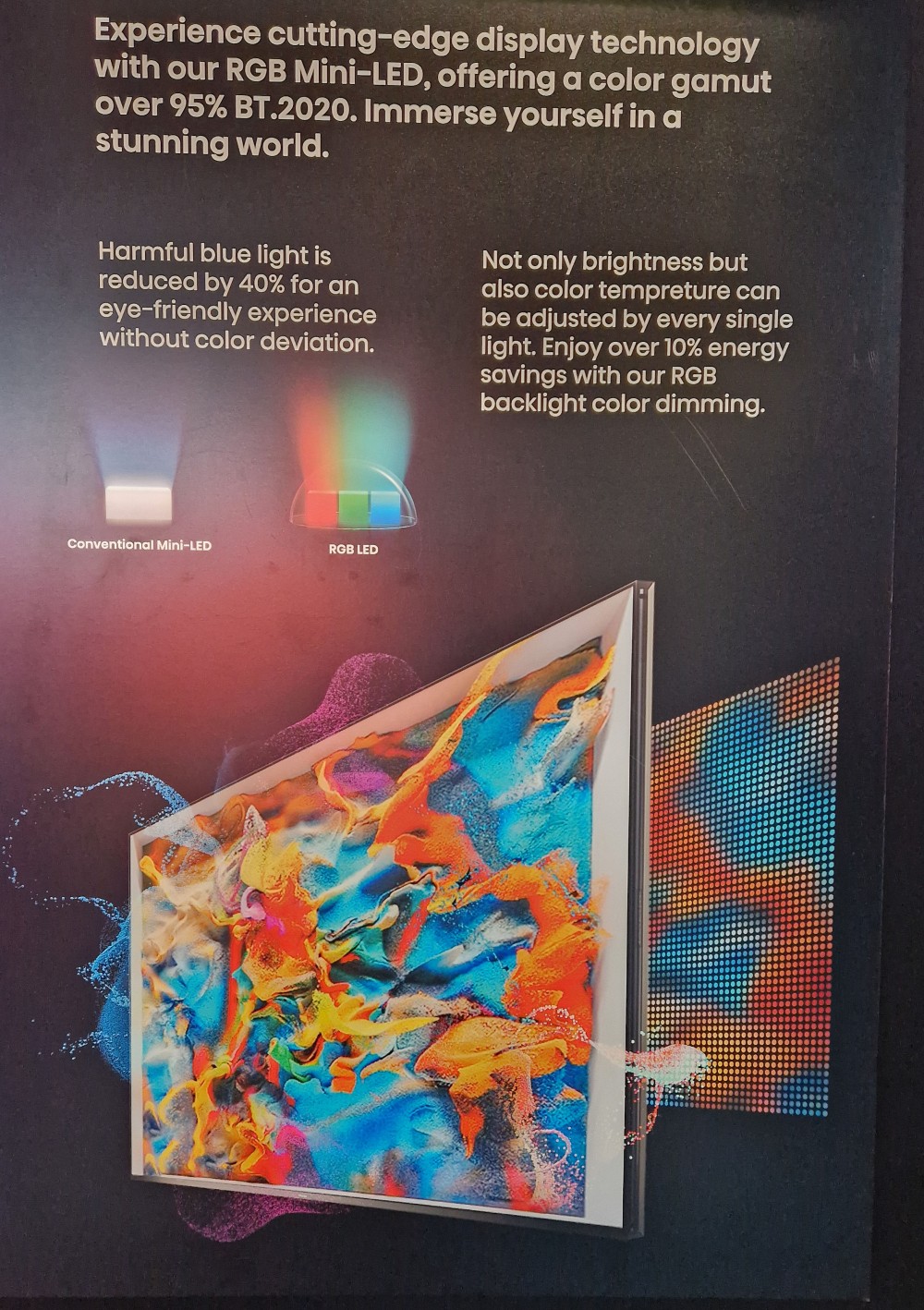 Hisense 116 UXQ, better energy management££££ Concretely, the delivered image presents more intense colors with richer and more subtle hues. Another advantage is that the energy efficiency of a screen equipped with RGB-MiniLED technology is higher than that of a conventional screen. A point that can be explained in a simple way. For example, if the screen must display a purple. It simply turns off the green LED of the RGB triplet and only keeps the red and blue "on". Whereas, on a screen of identical dimensions but with more conventional technology, the three lights, red, green and blue, will be produced, then the blue will be masked. Its emission is therefore a pure waste, which generates unnecessary overconsumption in terms of the overall energy balance of the equipment. Finally, RGB-MiniLED technology limits the emission of blue light to what is strictly necessary. This radiation, harmful to the eyes, is only present when the colors of the image to be displayed use blue. Remember that when using a quantum filter, the blue LEDs are permanently active, which can cause a certain amount of eye fatigue during prolonged viewing sessions.