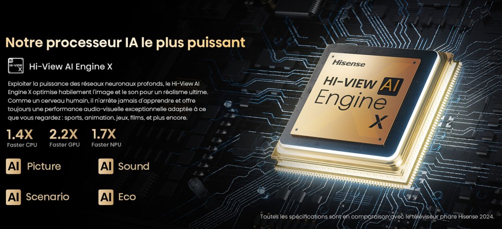 Hisense 116 UXQ, arrival of a Pentonic generation processor 800££££ However, to fully benefit from the advantages of this new technology, Hisense had to design a new video stream processing chip. Called Hi-View Ai Engine X, just like the RGB-MiniLED technology, it boasts unprecedented resources. More precisely, it is a Pentonic 800 generation chip (other players on the market are still only at the 700 vintage). This new version of processors significantly increases image processing capabilities and adaptation to the atmospheres to be rendered. This performance gain reaches 50%, particularly with regard to the use of artificial intelligence. In the gaming domain, for example, the functionalities relating to the recognition of the scene on the screen, contrast, and [abc]Upscaling[/abc] become more efficient. Likewise, for a gain in fluidity, the panel can work up to 165 Hz natively.