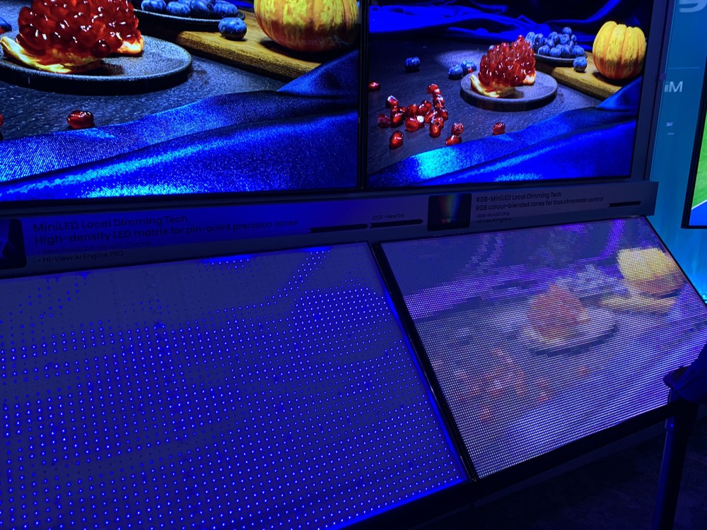 The icing on the cake is that this television is not just a simple prototype or a showcase of Hisense's technological know-how. It is already on the market and will also be present on the brand's stand at the Paris Audio Video Show 2025, taking place in Paris on October 25 and 26 at the Palais des Congrès de Paris, Porte Maillot. Named the 116UXQ, this television is sold in France at a price of 19,900 euros. Hisense 116 UXQ, precise management of fundamental colors…££££ But how does RGB-MiniLED technology represent a real technological breakthrough compared to the conventional Mini LED sector, and what is its qualitative contribution? To answer these questions, we must quickly review the operating principle of conventional Mini LED technology. It is based on a checkerboard of blue [abc]LEDs[/abc]. The light they generate then passes through a Quantum Dot filter which converts this blue light into red or green light in order to recover the fundamental colors essential for the reproduction of a color image, namely [abc]RGB[/abc] (or RGB). Each blue LED constitutes, in fact, a basic cell of the Local Dimming system. However, the panel's management electronics can only globally manage the three basic colors generated since they come from a single blue LED. However, the colorimetric response of the Quantum Dot filter as a function of the lighting intensity is not strictly identical for the three colors. Although very slight, this phenomenon affects the respect of the image's tones.