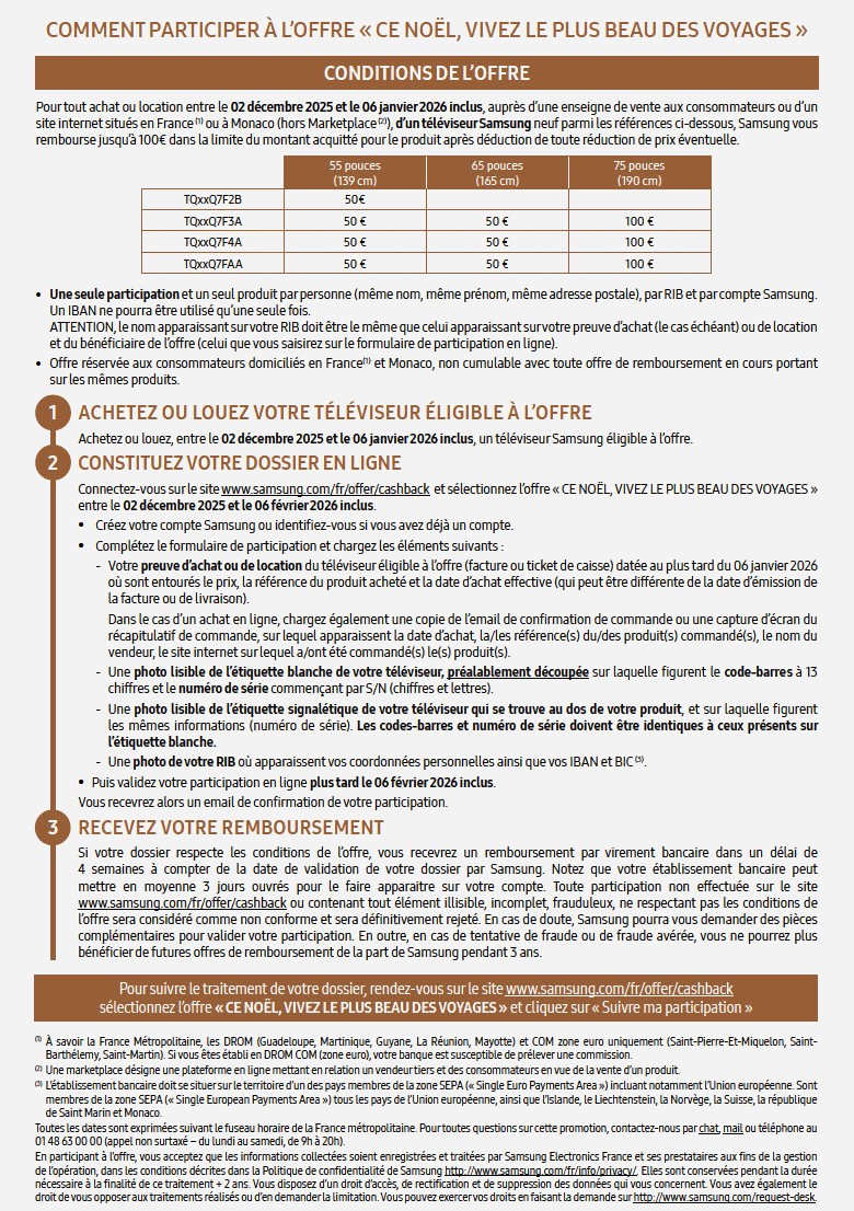 Until January 6, 2026, for any purchase of a television listed below, the brand will reimburse you: • €50 for a Samsung TQ55Q7F2B, Samsung TQ55Q7F3A, Samsung TQ55Q7F4A, Samsung TQ55Q7FAA, Samsung TQ65Q7F3A, Samsung TQ65Q7F4A or Samsung TQ65Q7FAA TV • €100 for a Samsung TQ75Q7F3A, Samsung TQ75Q7F4A or Samsung TQ75Q7FAA TV