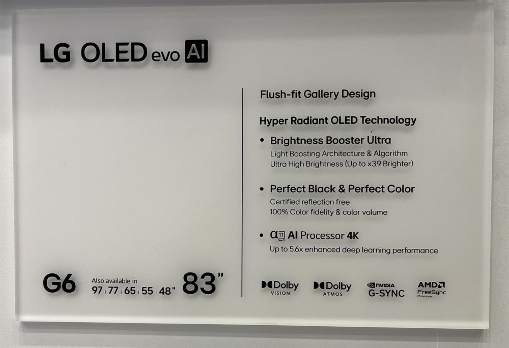 LG G6 OLED TV, AI and Picture Modes; The LG G6 displays feature numerous new video processing technologies, most notably Dual Super Upscaling to enhance both the outlines of on-screen elements and image textures (sky, sand, grass, etc.) for a sharper display and improved subtitle readability. Also noteworthy is Ambient Filmmaker Mode, which uses the ambient light sensor to adjust image brightness while meticulously respecting the director's or cinematographer's intentions. Finally, the new AI HDR Remastering process offers HDR rendering for SDR content by boosting contrast and sharpness. LG G6 OLED TV, Flush Fit Gallery Design, AI Object Remastering and Gemini; In 2026, LG G6 OLED TVs are designed for a perfectly flush wall mount, regardless of screen size. In terms of sound, the AI Sound Pro function allows the creation of an 11.1.2 virtual sound environment, while the AI Object Remastering process, based on Deep Learning, isolates the different components of a soundtrack—dialogue, music, and effects—to perform specific equalization of each and preserve, for example, the clarity of voices even during action scenes overflowing with spectacular audio effects. Similarly, LG G6 TVs can be integrated into an LG Sound Suite audio system (see our CES 26 news > LG Sound Suite 13.1.7 Dolby Atmos Flex Connect: revolutionary soundbar) composed of four wireless speakers (M5 or M7) to enjoy a Dolby Atmos FlexConnect configuration. Finally, LG G6 TVs automatically recognize the type of content being displayed (movie, sports, news) and adjust the equalizer accordingly: voices are boosted during news broadcasts or talk shows, and a good balance is achieved with movies. On the webOS side, Gemini should soon complement Copilot, and native support for the Zigbee and Thread protocols is included (LG acquired Homey). Finally, the LG G6 series comprises six models: • LG OLED48G6 (48") • LG OLED55G6 (55") • LG OLED65G6 (65") • LG OLED77G6 (75") • LG OLED83G6 (83") • LG OLED97G6 (97") Barring any surprises, the 97" model is expected to lack a Tandem OLED panel and instead feature a standard OLED Evo EX panel. More details to follow. To stay up-to-date with our publications and be the first to know about new products from brands and manufacturers presented at the 2026 Las Vegas trade show, click on the following link: CES 2026, discover all the new products live from Las Vegas
