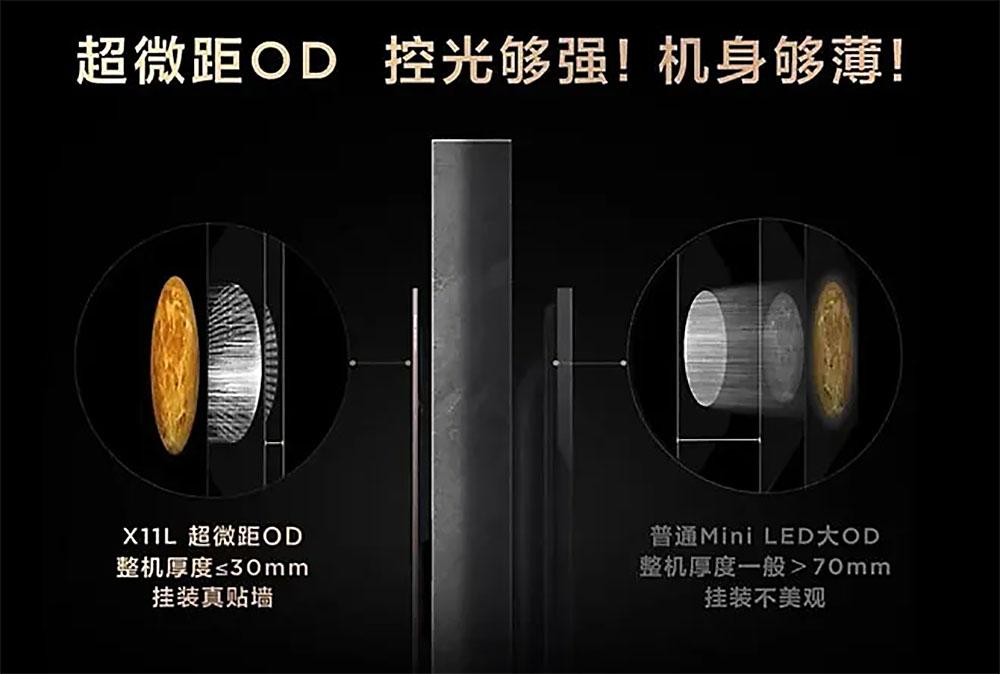 ] The TCL X11L: The superiority of white backlighting over RGB? The only possible explanation is that TCL considers its latest generation of Mini LED backlighting, the 8th, called SQD Mini LED (for Super Quantum Dots Mini LED), to be more efficient than RGB Mini LEDs. At the heart of the Gn 8 backlighting is TCL's exclusive Deep Color system, combining Super Quantum crystals (Super QLED), an UltraColor filter, and an advanced color fidelity algorithm. But also Quantum Dot nanocrystals with a more efficient alloy. The central point of TCL's demonstration? The use of RGB LEDs poses a series of problems when it comes to mixing the three primary colors. The manufacturer therefore aims to return to the use of white LEDs combined with Quantum Dot technology, offering a high concentration of "pure colors." With a high density of nanocrystals, TCL announces 95% purity for the three primary colors, without the need for RGB LEDs. An advantage of this backlighting system structure is the extremely reduced screen thickness, no more than 2 cm (OD 30 on the menu) using lenses and components based on Mini RGB LED specimens.