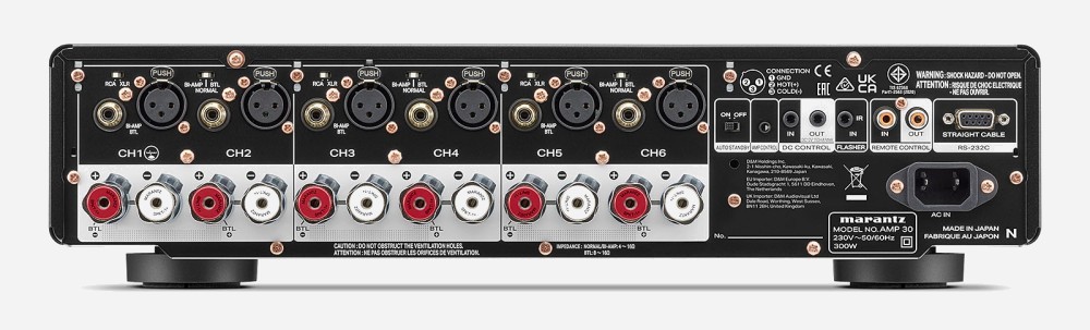 Available in black finish only. Suggested price: 4,000 euros. Key features of the Marantz AMP30: • Model: 6 channels • Power output: 6 x 200 W into 8 ohms, 6 x 400 W into 4 ohms • THD (Total Harmonic Distortion): 0.05% • Inputs: 6 RCA inputs, 6 XLR inputs, 1 RS-232-C port, 1 12V Trigger input • Outputs: 6 pairs of binding posts • Dimensions (W x H x D, mm): 442 x 111 x 442 mm • Power consumption: 300 W (0.2 W in standby) • Weight: 10 kg