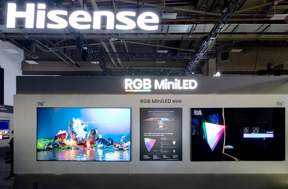 CES 26, the nit war turns into a color war££££ While improving brightness performance remains relevant, the nit war is no longer primarily at the heart of brand communication (even though TCL announced 10,000 nits for its SQD X11L TV series, see first photo below). This has indeed mutated into a color war, with the Rec.2020 gamut as the reference point, whose coverage, more or less guaranteed at 100% (110% for the Hisense UXS TV), is being highlighted. A new battleground synonymous with technological innovation, opened by the manufacturer Hisense in 2025 with RGB Mini LED technology, and on which the Chinese firm intends to maintain its leadership with the announcement this year of the addition of a fourth color to its premium backlighting systems, that of the Hisense 116UXS RGB Mini LED Evo TVs (see our CES 26 news > RGB Mini LED Evo 4 primaries: Hisense wants to show us all the colors, see photo below) and the Hisense 163MXS Micro LED TVs (see our CES 26 news > Hisense 163MXS: first Micro LED 4 primaries (RGBY) for 100% BT.2020).