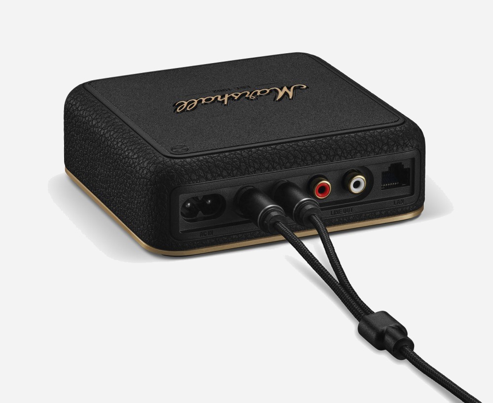 First and foremost, let's talk about the product's name. It's anything but insignificant. By naming this newcomer Heddon, Marshall pays homage to Heddon Street, the London alleyway immortalized by David Bowie on the cover of the album The Rise and Fall of Ziggy Stardust and the Spiders from Mars. A Rock 'n' Roll name for a product that bridges the gap with the future of wireless audio on the one hand, and continues Marshall's tradition of naming its products in tribute to British musical heritage on the other. Marshall Heddon: Wi-Fi, Ethernet, and Hi-Res Audio. The Marshall Heddon is a compact streamer (network player), dressed in the brand's signature grainy black vinyl and gold accents. On the back, there's a stereo RCA output and an optical output for connecting it to any traditional amplifier or active system.