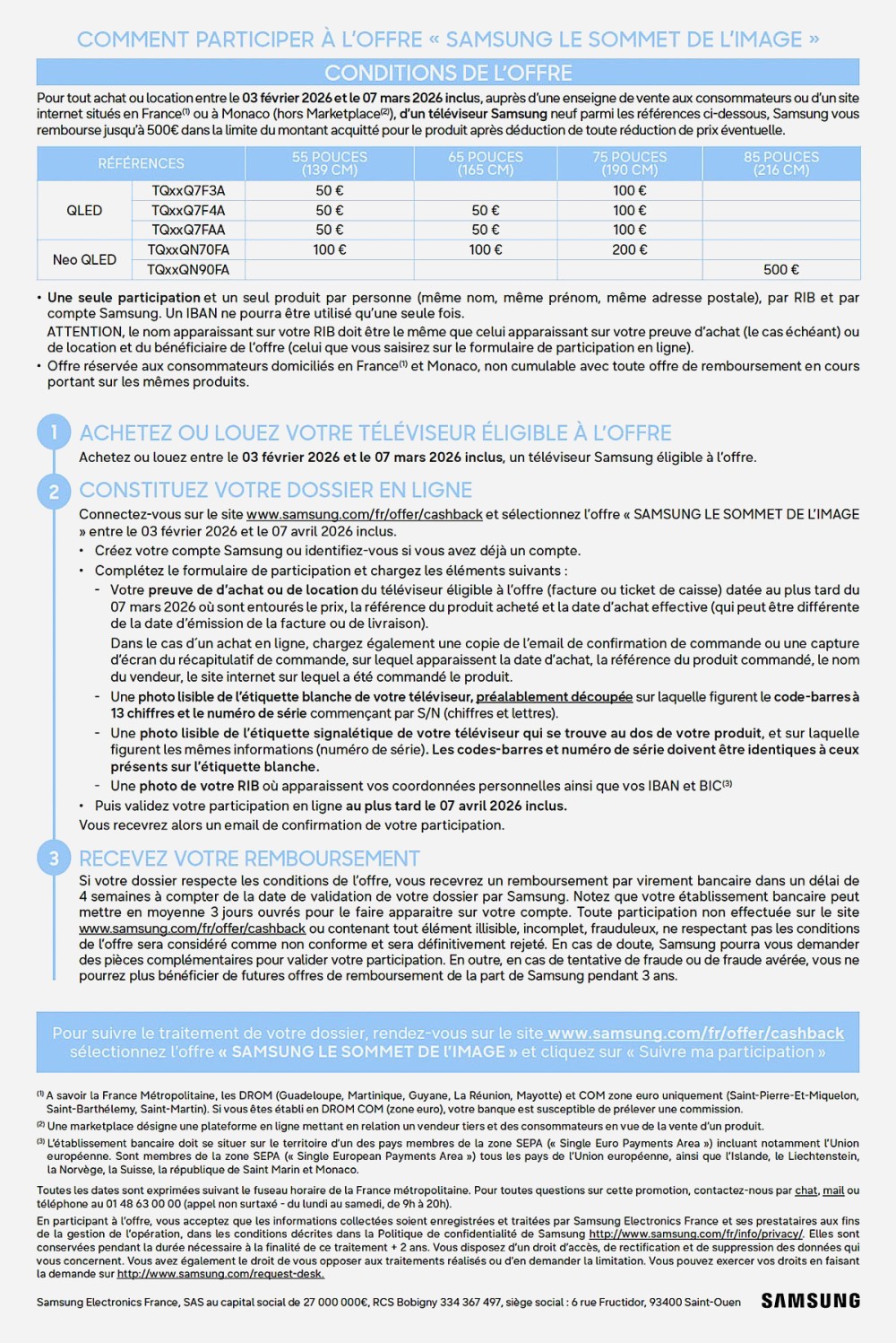 Until March 7, 2026, for any purchase of a television listed below (click on its reference to learn more about the product), the brand will reimburse you: • €50 for a Samsung TQ55Q7F3, Samsung TQ55Q7F4, Samsung TQ55Q7FA, Samsung TQ65Q7F3 or Samsung TQ65Q7F4 TV • €100 for a Samsung TQ75Q7F3, Samsung TQ75Q7F4, Samsung TQ75Q7FA, Samsung TQ55QN70FA or Samsung TQ65QN70FA TV • €200 for a Samsung TQ75QN70FA TV • €500 for a Samsung TQ85QN90F TV