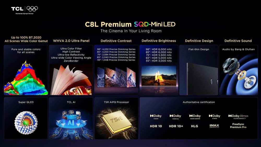 TCL C8L SQD Mini LED Gen 8 TV: A Closer Look at the Improvements. At the heart of the Gen 8 backlighting are further optimized diodes called Super Condensed Micro Lens (34 patents in 2026) to combat Color CrossTalk (blending of colors between adjacent areas). TCL's exclusive Deep Color system combines Super Quantum Dot (Super QLED) crystals with a more efficient alloy, an UltraColor filter, and an advanced color fidelity algorithm (26-bit internal processing versus 23-bit in 2025). The goal remains the same: to eliminate Color CrossTalk, improve color purity, and maximize brightness without using RGB LEDs.