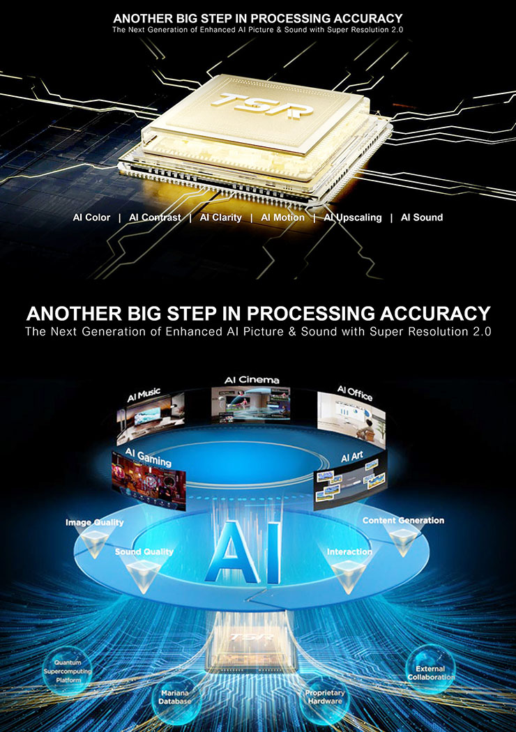 • Inputs: 4 [abc]HDMI[/abc] 2.1 inputs, 1 USB 3.0 host port, 1 USB 2.0 host port, 1 Ethernet port, 1 CI+ port; • AirPlay 2 multimedia; • HomeKit multimedia; • Google Assistant multimedia; • Works with Alexa multimedia; • Google TV multimedia; • Google Gemini multimedia; • MEMC motion compensation; • Mini LED local dimming backlight system; • Input lag: < 6 ms at 2160p/60Hz; • Number of zones: 1008 for the 55", 2040 for the 65", 2584 for the 75", 3200 for the 85", and 4032 for the 98"