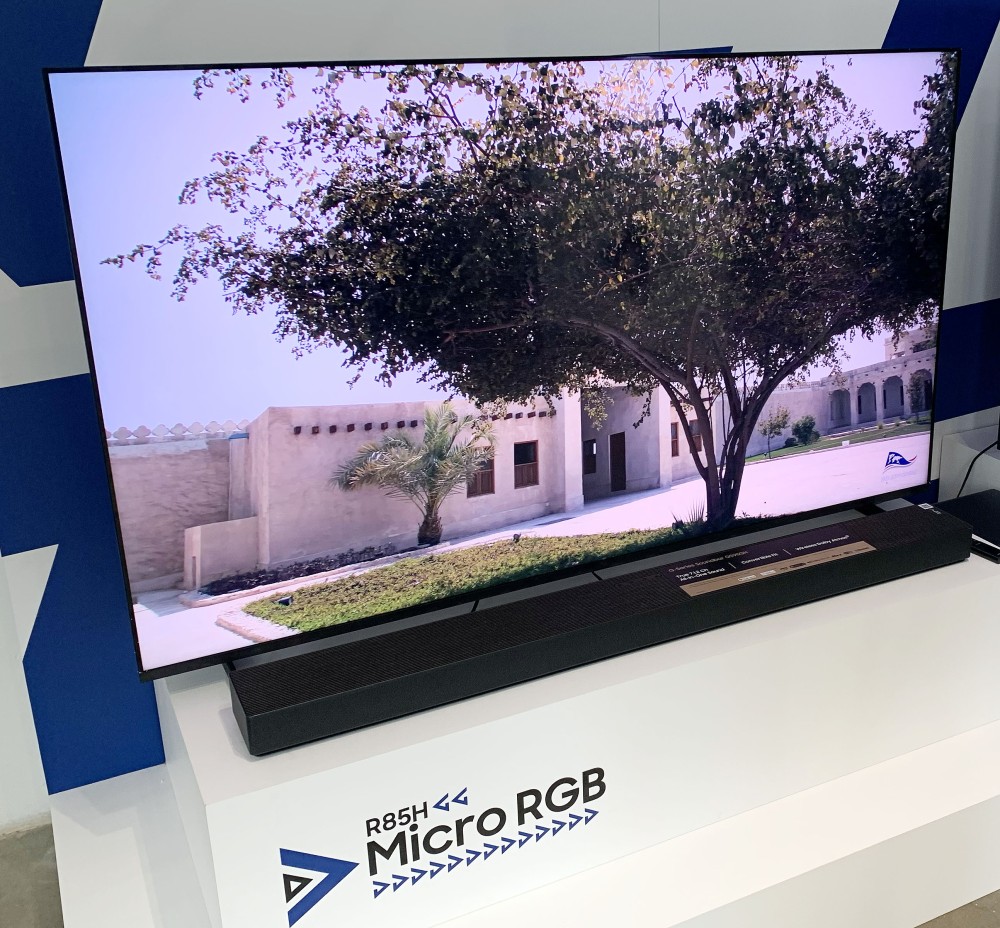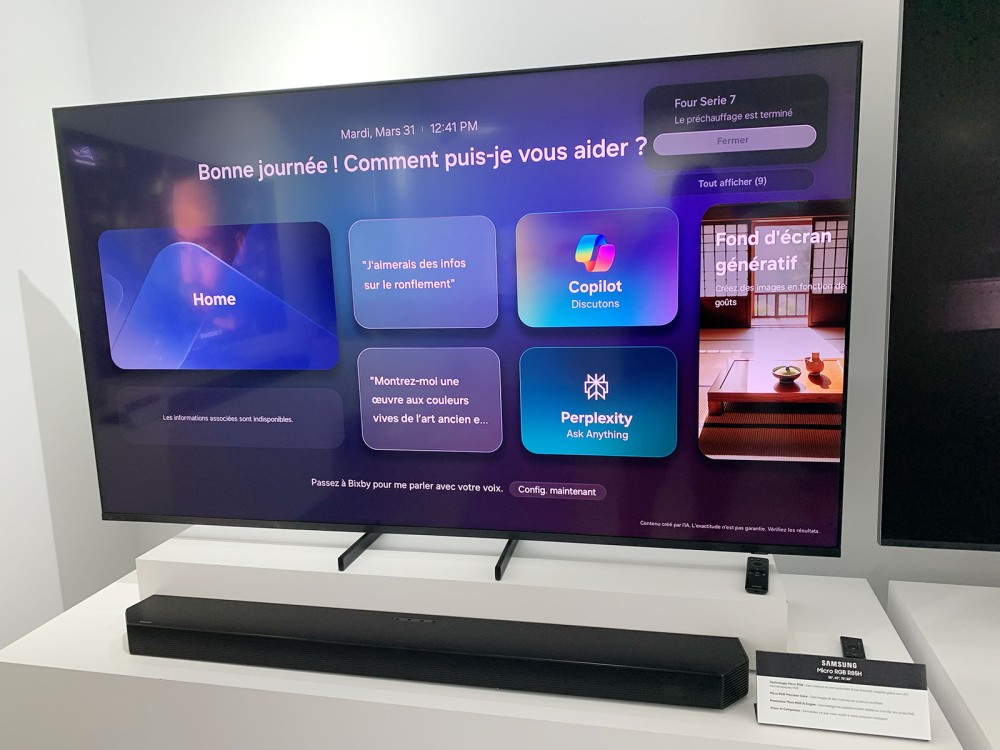 Samsung Micro RGB: 90 µm LEDs and advanced AI££££ On the technical side, the brand reminds us that the Micro RGB is based on red, green and blue LEDs of less than 100 µm (hence the name Micro and not Mini), 90 µm to be exact, each emitting its own light for ultra-precise backlight control and increased color accuracy. All of this is supported by the 4K AI Upscaling Pro, Ultimate Micro Dimming Pro, and AI Motion Enhancer Pro algorithms, which refine brightness, ensure the fluidity of the displayed signal (smoothing panning movements, for example), and precisely manage the sharpness of the displayed image, all in real time. Glare Free, 165 Hz, BT.2020 gamut, and HDR10+ Advanced: a TV built for performance. Operating at 120 Hz (VRR 144 Hz), the LCD panel offers DLG (Dual Line Gate) 240 Hz mode (in 1080p). A new Micro RGB AI Engine Pro processing system also makes its debut, based on a latest-generation AI chip capable of analyzing video frame by frame. This processor notably integrates the Micro RGB Color Booster Pro and Auto HDR Remastering Pro functions, to offer a more impactful HDR rendering and colorimetry that approaches a perception "close to reality". Specifically, Samsung Micro RGB TVs support the new HDR10+ Advanced format (see our HDR10+ Advanced news article: Samsung's response to Dolby Vision 2 HDR, Prime Video supports it...). Samsung also highlights the Micro RGB Precision Color 100 feature, which uses high-quality RGB diode triplets for unprecedented light purity, and an optimized backlighting system for each LED, all to ensure 100% coverage of the BT.2020 color gamut, certified by the German VDE organization. Vision AI Companion and Eclipsa Audio: the complete Samsung 2026 experience. Beyond picture quality, Samsung is capitalizing on its in-house AI portal, now grouped under the name Vision AI Companion. This multi-agent AI interface (Copilot and Perplexity) combines LLM with Bixby and Alexa voice assistants to offer conversational searches, interactive Q&A, proactive recommendations, and access to features like Live Translate, Click to Search, and Generative Wallpaper (dynamic creation of wallpapers tailored to your tastes). The OTS Lite 2.0 audio section of these TVs, with a total power of 30W, ensures wireless Dolby Atmos compatibility, offers the brand's Adaptive Sound Pro features (to adapt the sound output to the room and content type), AVA Pro (Active Voice Amplifier Pro), and Q-Symphony to combine the TV's speakers with those of compatible Samsung soundbars. New to the lineup is the Eclipsa Audio technology (see our CES 25 news > Google's Eclipsa Audio, a competitor to Dolby Atmos, in Samsung 2025 TVs and soundbars), featured on the Samsung R95H Micro RGB TV series, as with all Samsung TV series in the 2026 range. Specifically, it includes a single DVB-T2, DVB-S2, and DVB-C tuner. Finally, a Zero Gap Wall Mount is available for the Samsung R85H Micro RGB TVs, allowing for a perfectly flush wall mount and full enjoyment of the stunning design. [
