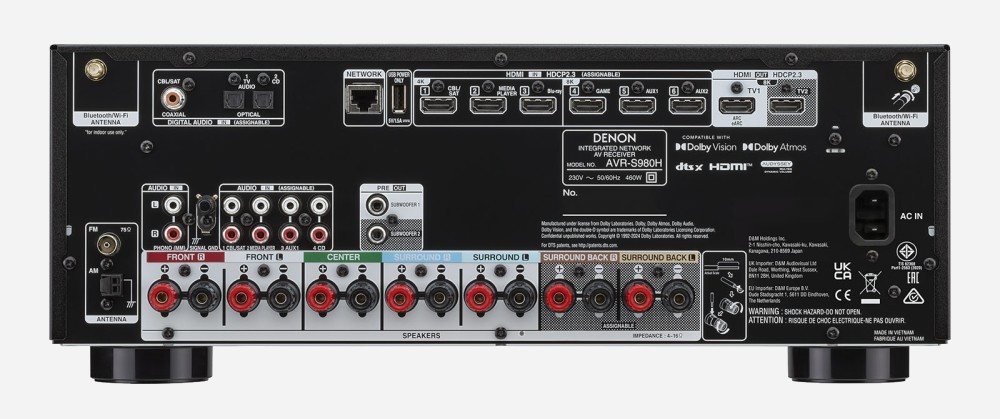 The most significant evolution concerns video. Whereas the AVR-S950H was limited to 2160p/60Hz support and 30Hz Ultra HD/4K upscaling, the AVR-S980H adopts a full HDMI 2.1 platform with three 8K inputs, 8K pass-through compatibility, 8K UHD upscaling, and support for the latest HDR formats, including HDR10+, Dolby Vision HDR, and HLG HDR. While the number of HDMI ports is reduced from eight to six, the move to the HDMI 2.1 standard marks a clear break from the previous generation.