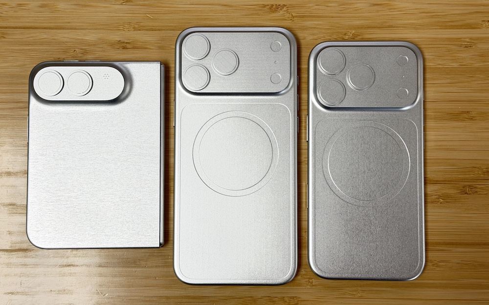 Discover new "leaked" photos of a dummy iPhone Ultra, the foldable model expected at the end of the year, shown alongside other Apple models.